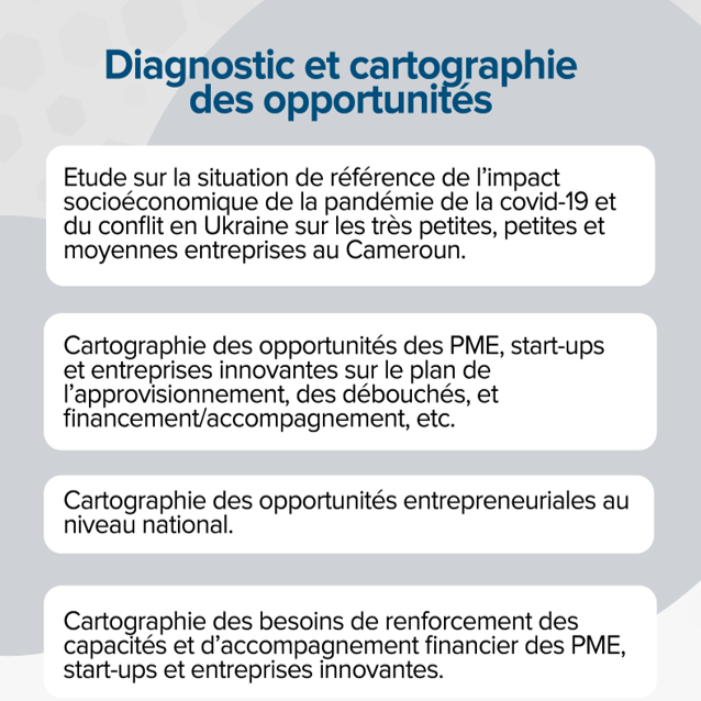 Bien que des effets positifs de relance soient apparus, la guerre en Ukraine constitue un choc additionnel qui freine la dynamique de croissance, notamment pour les PME. Le Gouvernement camerounais entend donc accélérer le Pilier 2 de sa stratégie (résilience économique et financière) pour améliorer la résilience et le relèvement des PME affectées. À cet effet, en collaboration avec le PNUD, il mobilise un financement additionnel sous forme de prêt auprès de la BADEA, dans le cadre de l’ «Opération de Soutien au Secteur Privé camerounais» (OSSP-CMR).