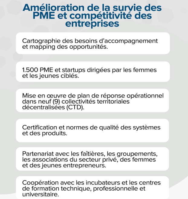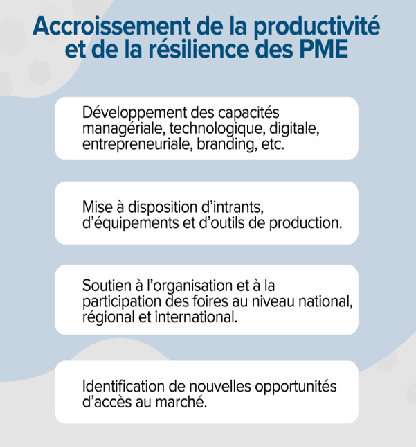 Le projet vise d’une part à renforcer la résilience du secteur privé, notamment des PME, face aux conséquences de la COVID-19 et autres chocs externes. D’autre part à soutenir la relance post-COVID et la transformation structurelle de l’économie Camerounaise.
